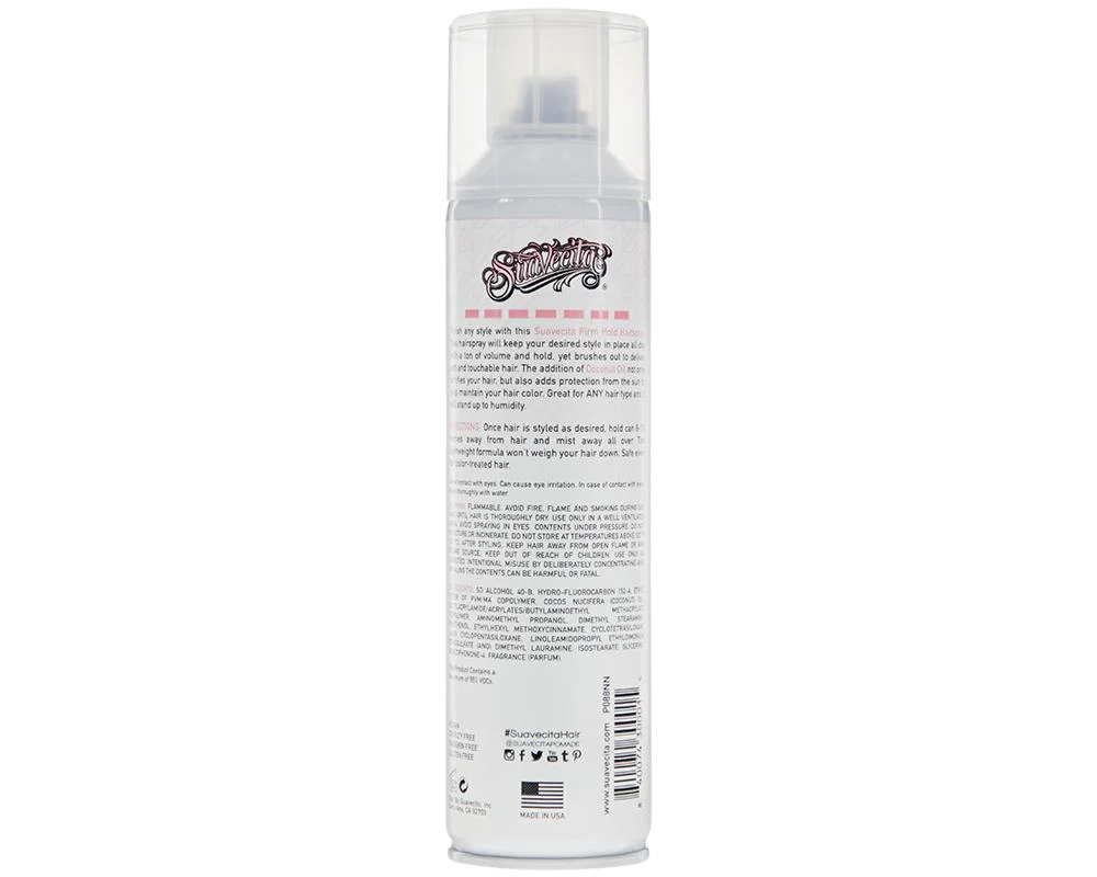 This Suavecita Hairspray will keep your desired hairstyle in place all day with a ton of volume, lift and hold, yet brushes out to deliver a soft touchable finish. The addition of Coconut Oil not only fortifies your hair, but also adds protection from the sun to help maintain your hair color. Great for ANY hair type and it will stand up to humidity very well. This hairspray can also be used as a finishing spray.
